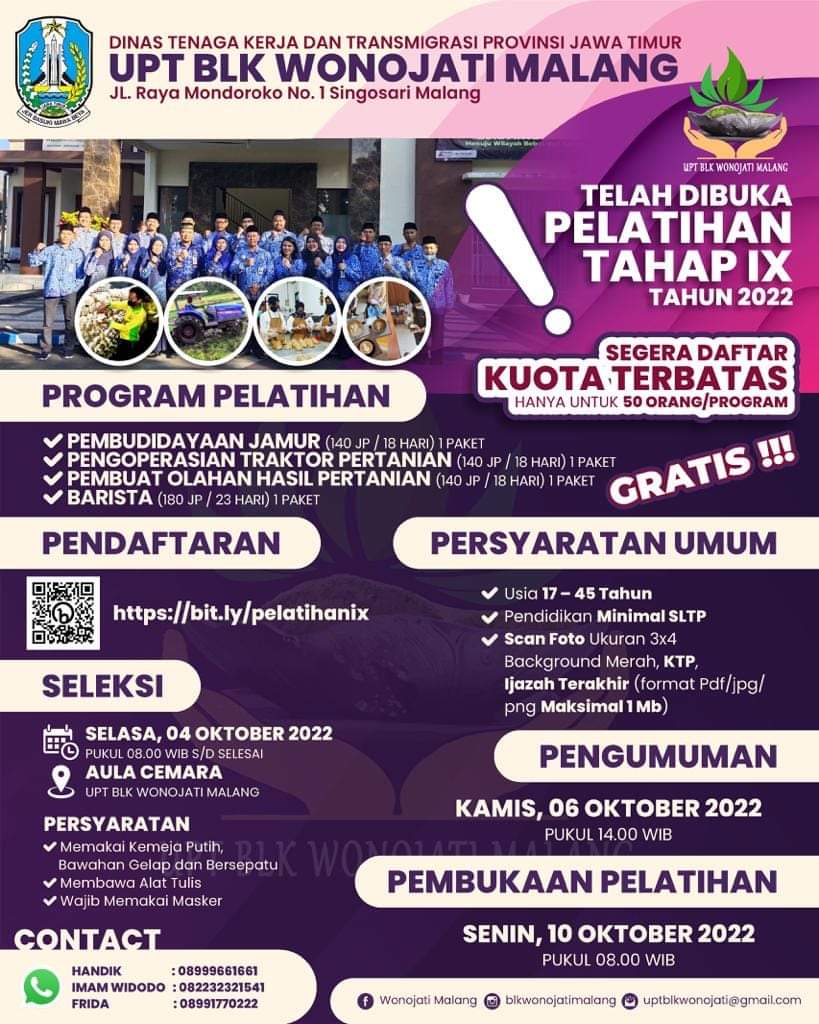 UPT BLK WONOJATI MALANG MEMBUKA PELATIHAN TAHAP IX TAHUN 2022