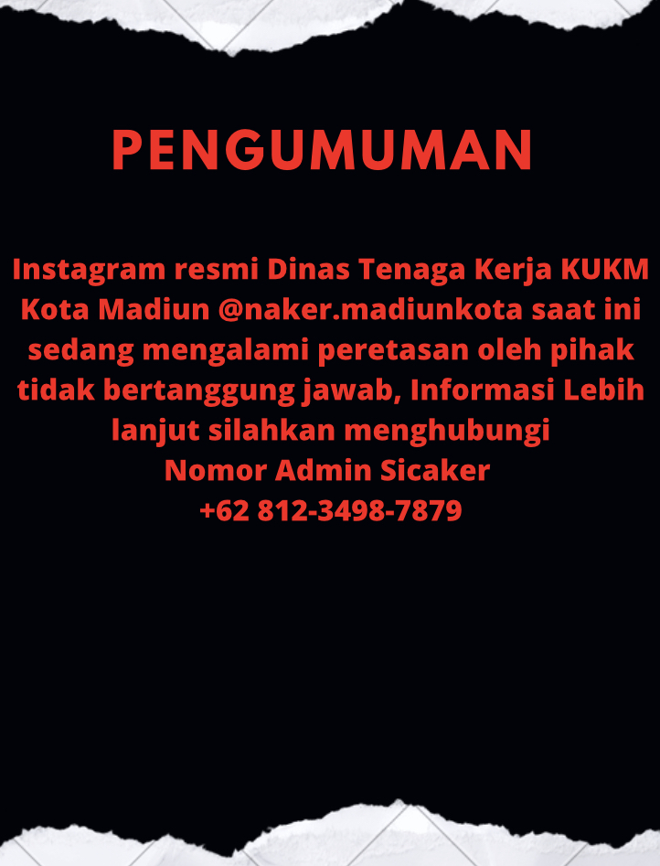 PENGUMUMAN : AKUN IG RESMI DISNAKER KUKM KOTA MADIUN MENGALAMI PERETASAN