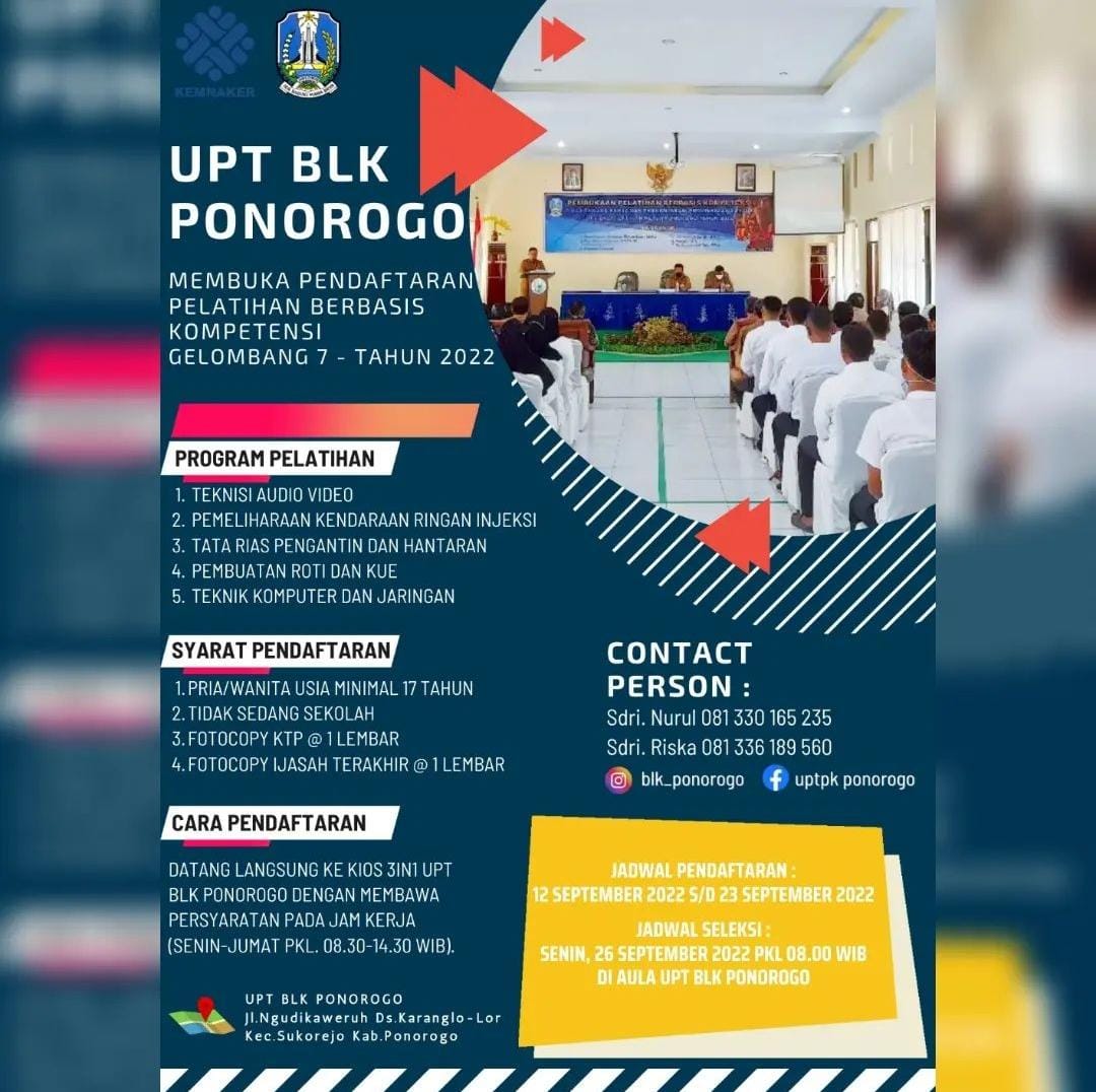 UPT BLK PONOROGO MEMBUKA PENDAFTARAN PELATIHAN BERBASIS KOMPETENSI GELOMBANG 7-TAHUN 2022