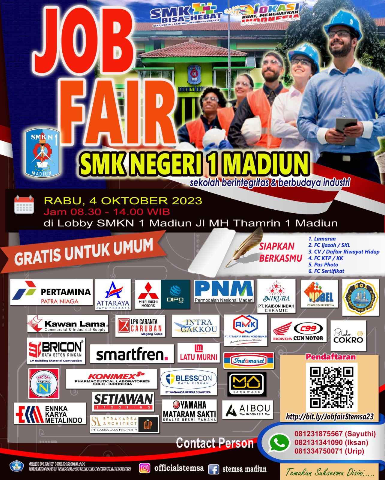 INFO UP DATE JOB FAIR 2023 Ada 26 Perusahaan Dibuka GRATIS utk ALUMNI dan UMUM 🏫 PELAKSANAAN STEMSA JOB FAIR 2023 : Hari : RABU Tanggal : 4 Oktober 2023 Waktu : 08.30 - 14.00 wib Tempat : Lobby SMKN 1 Madiun Jl MH Thamrin 1 Madiun 📝 PENDAFTARAN MELALUI LINK : https://bit.ly/JobfairStemsa23 ¬Calon Pelamar wajib mengenakan baju putih lengan panjang, celana gelap dan bersepatu 📲CP. 081231875567 (Sayuthi) 📲CP. 082131341090 (Iksan) 📲CP. 081334750071 (Urip) BKK SMKN 1 Madiun